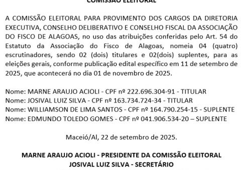 ASSOCIAÇÃO DO FISCO DE ALAGOAS COMISSÃO ELEITORAL A COMISSÃO ELEITORAL PARA PROVIMENTO DOS CARGOS DA DIRETORIA EXECUTIVA, CONSELHO DELIBERATIVO E CONSELHO FISCAL DA ASSOCIAÇÃO DO FISCO DE…