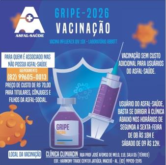 A ASFAL inicia mais uma campanha de prevenção à saúde, através da vacinação contra a gripe. A vacina é a QIV 10x Influenza, do Laboratório ABBOTT, englobando quatro cepas diferentes. Os usuá…